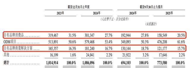 虽然鹿客科技营收及利润均上涨,但从数据来看,公司自有品牌相关业务却出现下滑。其中自有品牌消费品于2024年及2025年前三季度均出现营收同比减少;自有品牌商业解决方案则在2025年前三季度出现下滑。