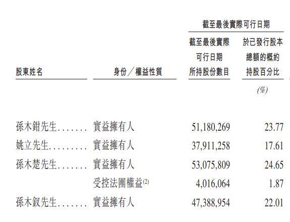 从持股比例来看,孙木钳持股23.77%,姚立持股17.61%,孙木楚持股26.52%,孙木钗持股22.01%,创始人团队合计持股比例高达89.91%。其中,孙氏家族的持股比例达72.3%。
