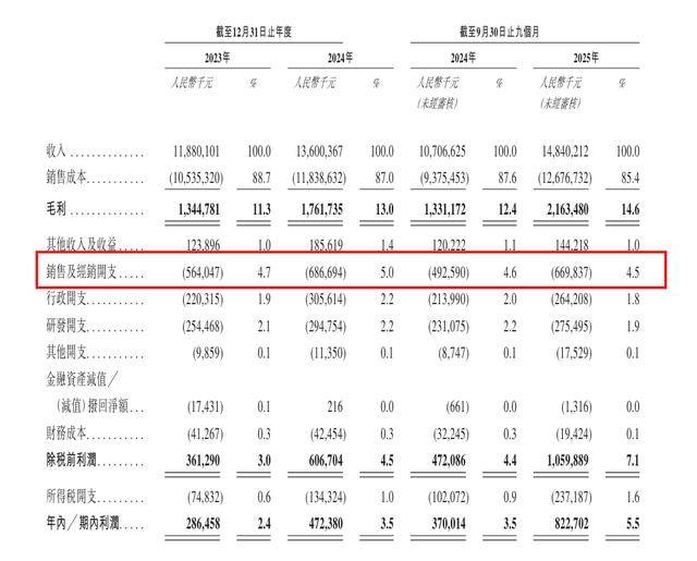 2023年、2024年及2025年前9个月,公司的销售及经销开支分别为5.64亿元、6.86亿元及6.69亿元,逐年走高,占比分别为4.7%、5%及4.5%。