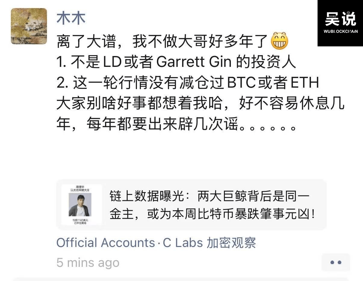 吴说获悉,火币创始人李林在朋友圈回应称,其并非 LD 或 Garrett Gin 的投资人,本轮行情中未减仓 BTC 或 ETH,并表示近年来多次被传谣言,不得不反复澄清。