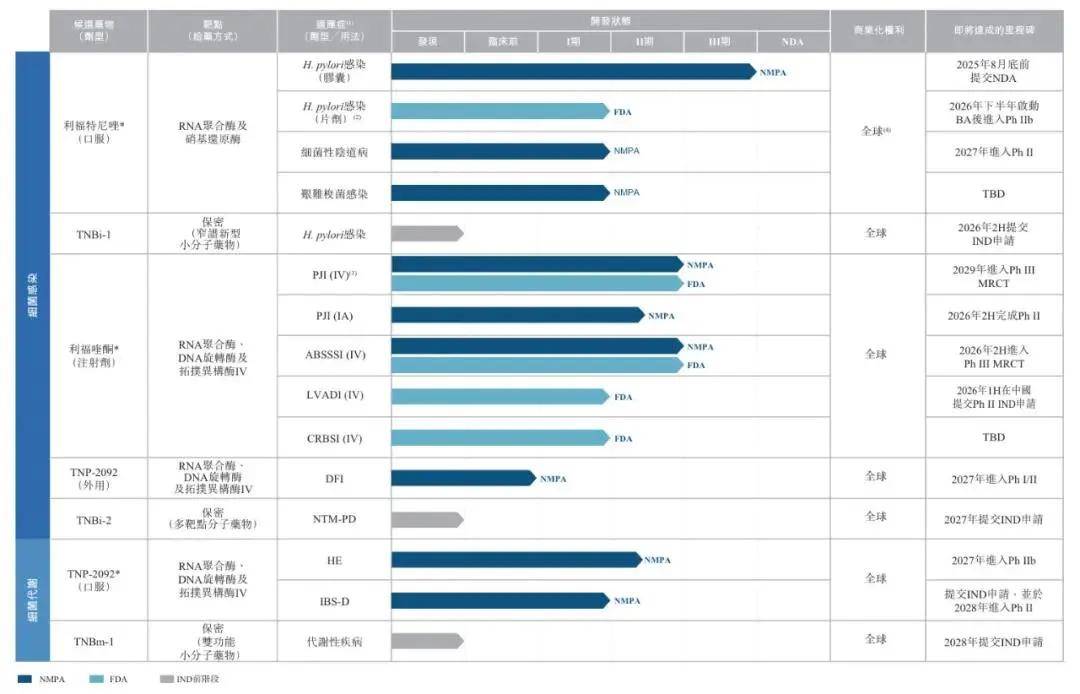 即利福特尼唑(TNP-2198),是治疗幽门螺杆菌感染的新分子实体(「NME」)候选药物;利福喹酮(TNP-2092)注射剂,一款潜在三靶点治疗植入体相关细菌感染的候选药物;及TNP-2092口服制剂,全球首个用于治疗肠道菌群代谢相关疾病的多靶点候选药物。