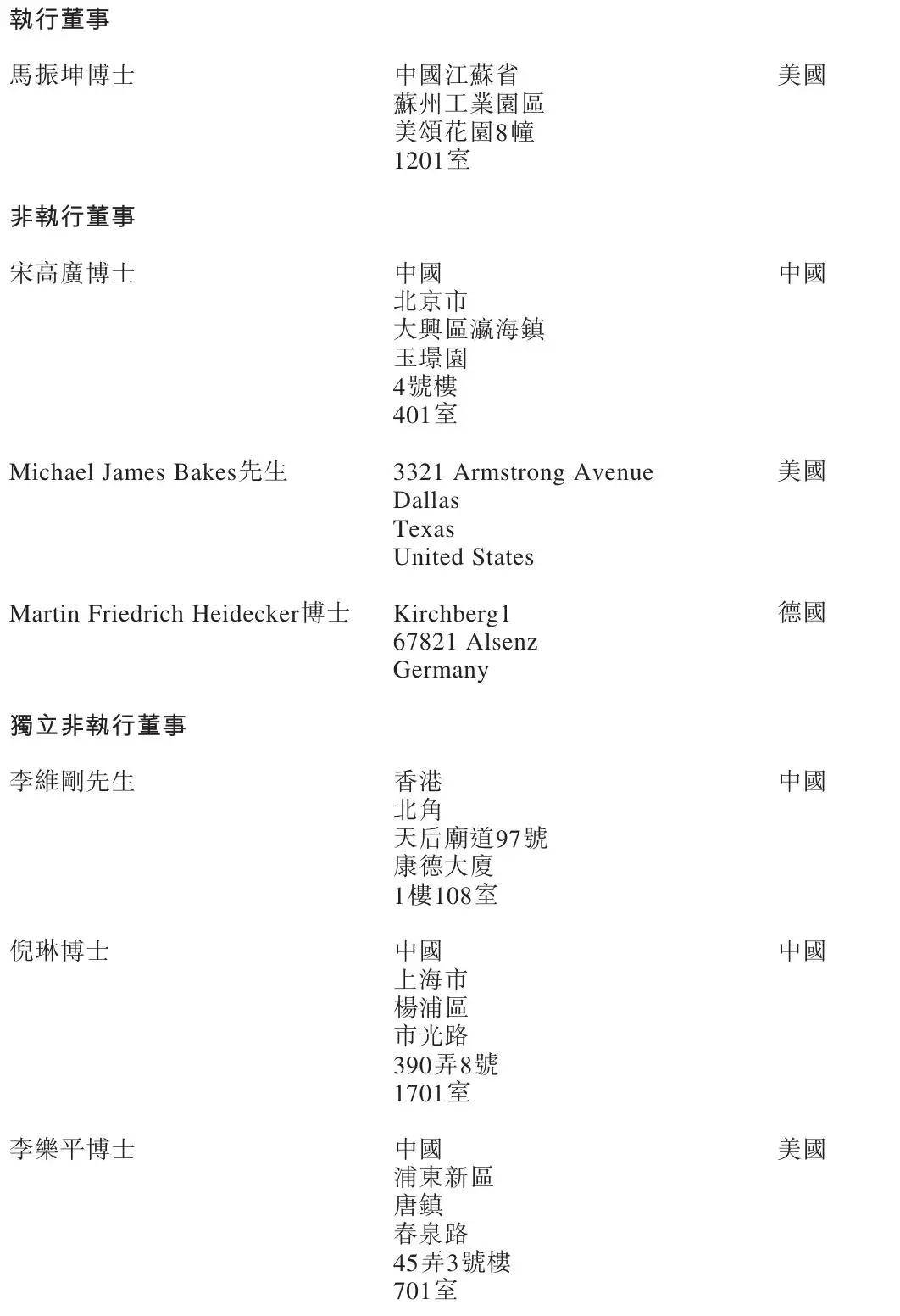 马振坤博士、Michael James Bakes、李乐平博士均为美国籍,Martin Friedrich Heidecker为德国籍。