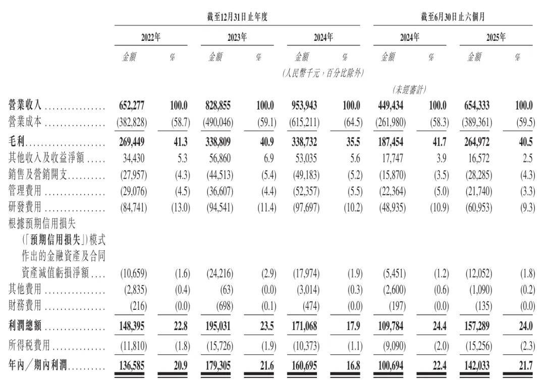 招股书显示,芯碁微装2022年、2023年、2024年营收分别为6.52亿元、8.29亿元、9.54亿元;毛利分别为2.69亿元、3.39亿元、3.39亿元;毛利率分别为41.3%、40.9%、35.5%;期内利润分别为1.37亿元、1.79亿元、1.61亿元;期内利润率分别为20.9%、21.6%、16.8%。