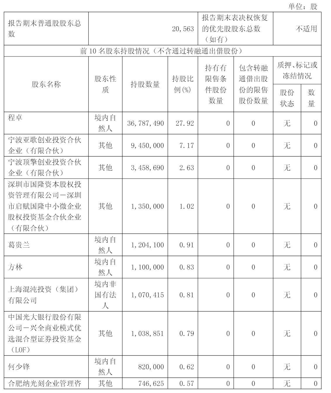 葛贵兰持股为0.91%,方林持股为0.83%,上海混沌投资(集团)有限公司持股为0.81%,中国光大银行股份有限公司-兴全商业模式优选混合型证券投资基金(LOF)持股为0.79%,何少锋持股为0.62%,合肥纳光刻企业管理咨询合伙企业(有限合伙)持股为0.57%。