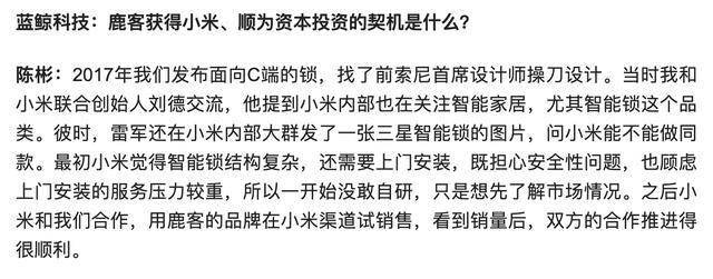 据媒体报道,鹿客创始人兼CEO陈彬近日在接受访谈时表示,八年前,小米创始人雷军在内部群转发了一张三星智能锁的图片,并提问:“小米能不能做同款?”考虑到安装服务与安全问题的复杂性,小米最终未选择自研,而是将这一品类的开拓任务交给了鹿客科技。