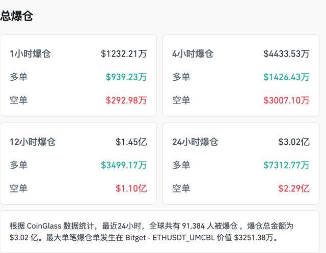 CoinGlass数据显示,最近24小时,加密货币市场共有超9.14万人爆仓,爆仓总金额超3亿美元。