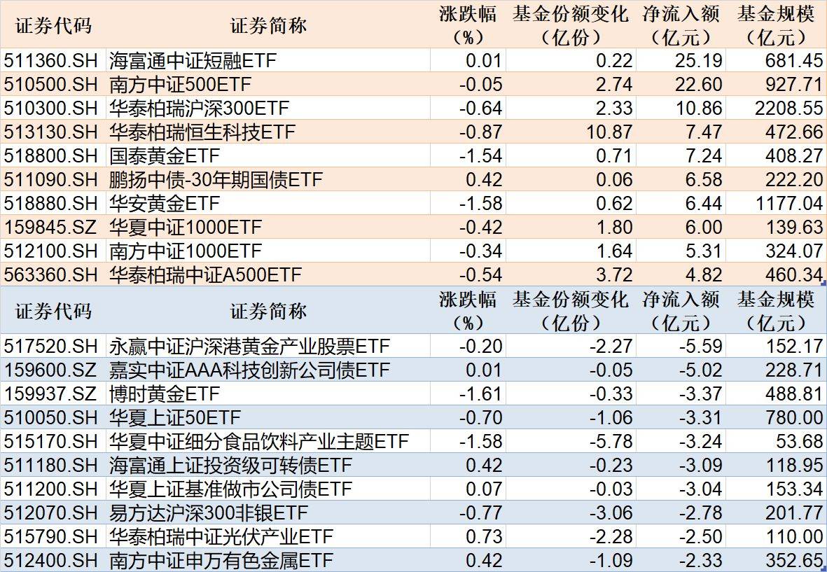 与此同时,永赢中证沪深港黄金产业股票ETF份额减少 2.27 亿份,净流出额 5.59 亿元;嘉实中证AAA科技创新公司债ETF份额减少 0.05 亿份,净流出额 5.02 亿元;博时黄金ETF份额减少0.33亿份,净流出额 3.37 亿元。