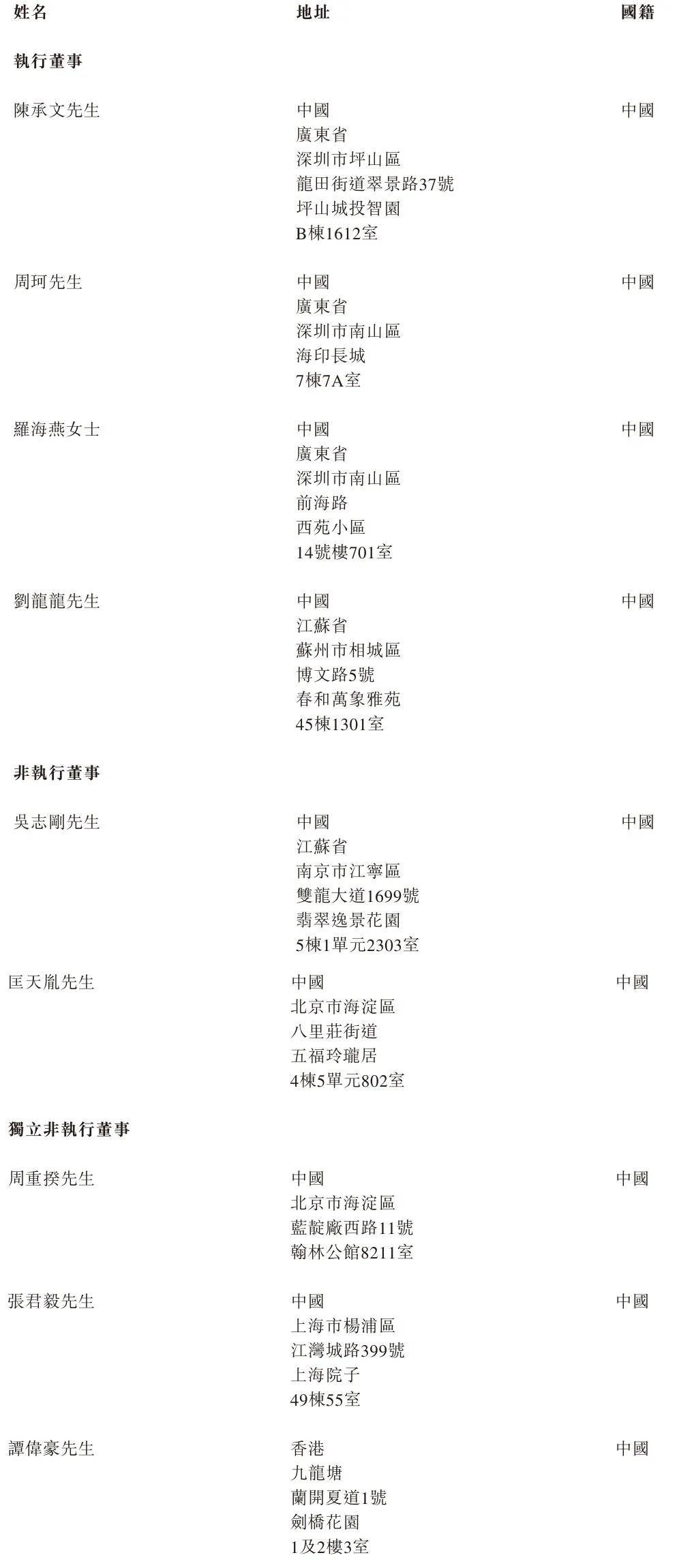 承泰科技执行董事分别为陈承文、周珂、罗海燕女士、刘龙龙;非执行董事分别为吴志刚、匡天胤;独立非执行董事分别为周重揆、张君毅、谭伟豪。