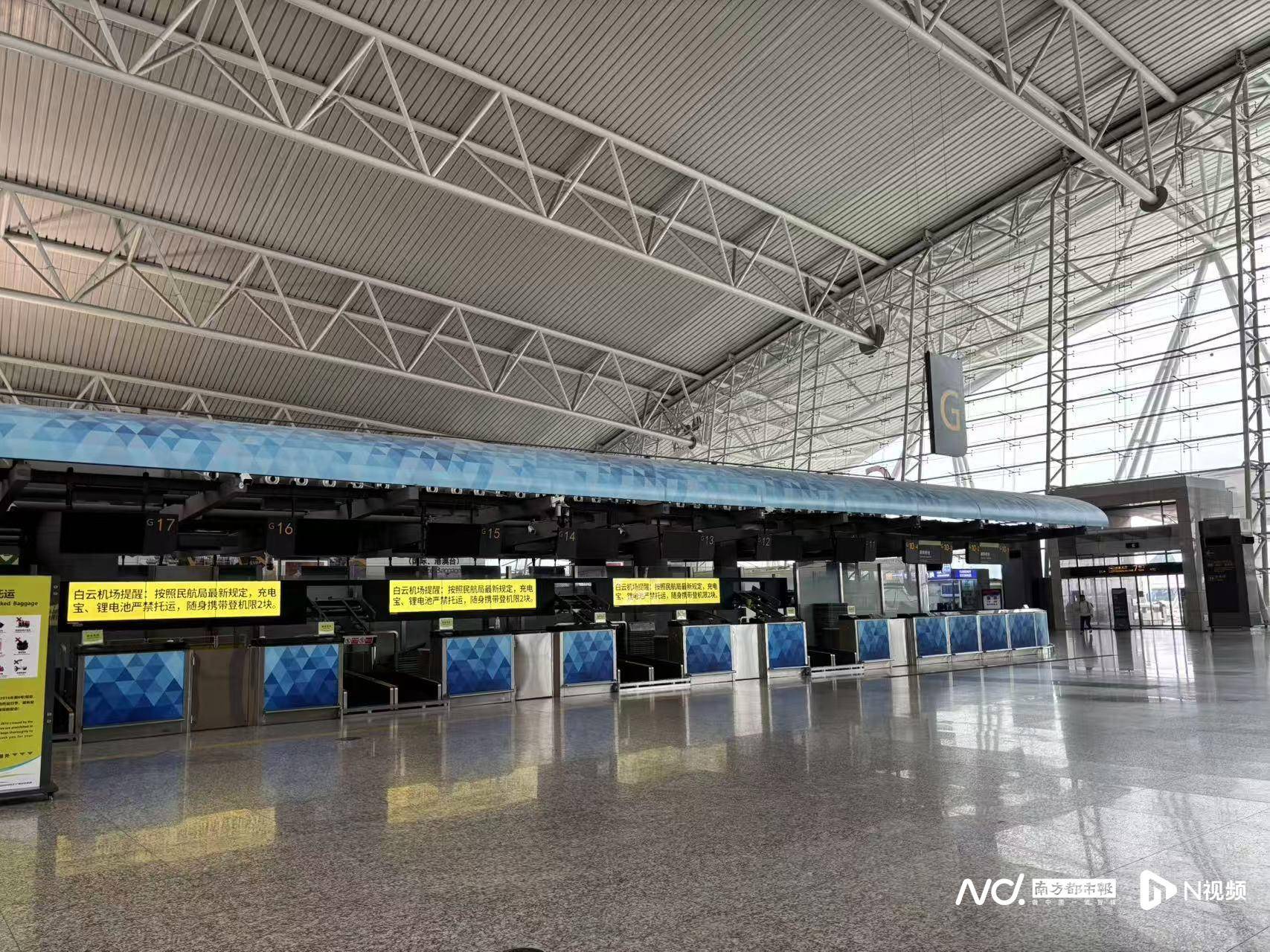 T1航站楼值机大厅显得空荡荡,部分值机柜台关闭。