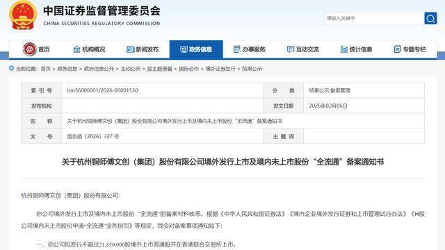 瑞财经 赵盼盼2月6日,据中国证监会披露,杭州铜师傅文创(集团)股份有限公司(以下简称“铜师傅”)通过IPO备案。
