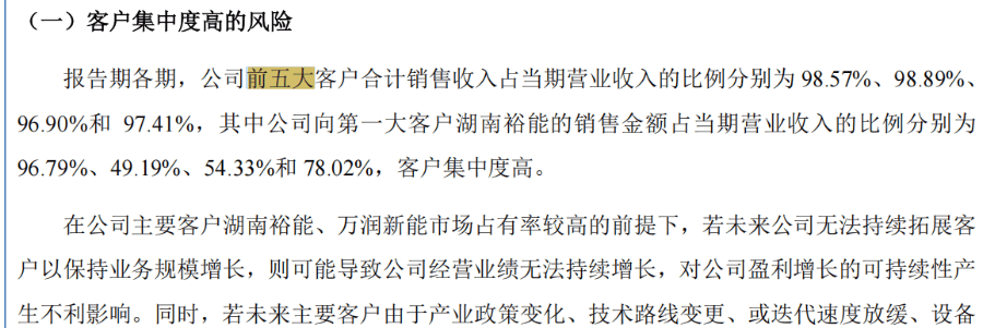 报告期各期,华汇智能前五大客户合计销售收入占当期营业收入的比例分别为98.57%、98.89%、96.90%和97.41%,其中公司向第一大客户湖南裕能的销售金额占当期营业收入的比例分别为96.79%、49.19%、54.33%和78.02%。