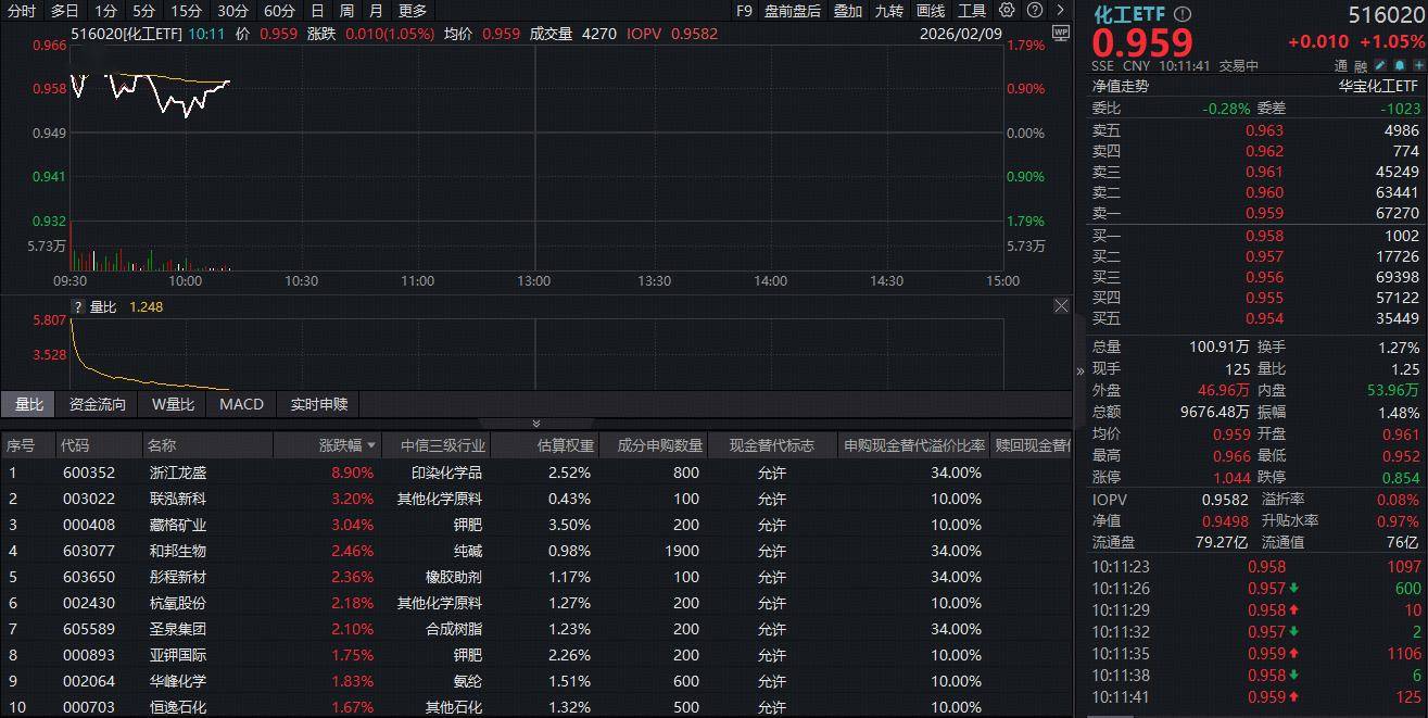 化工板块今日(2月9日)再度拉升,反映化工板块整体走势的化工ETF(516020)高开后持续红盘震荡,盘中场内价格最高涨幅达到1.79%,截至发稿,涨1.05%。