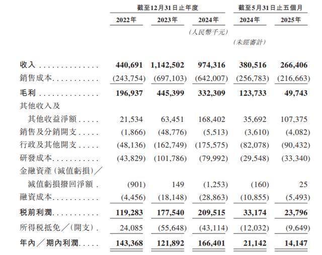 业绩方面,于2022年度、2023年度、2024年度及2025年度截至5月31日止五个月,瀚天天成收入分别约4.41亿元、11.43亿元、9.74亿元及2.66亿元;同期,年内/期内利润分别约为1.43亿元、1.22亿元、1.66亿元及0.14亿元。