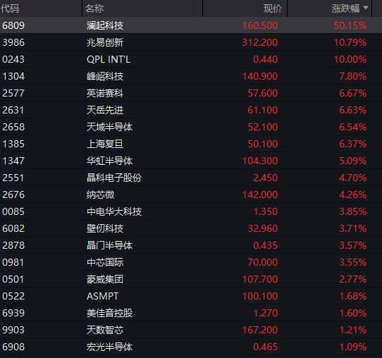 港股半导体股持续走强,兆易创新涨近11%,华虹半导体涨超5%,中芯国际涨超3%。澜起科技IPO首日大涨超50%