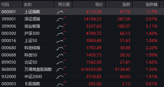 A股:截至发稿,沪指涨1.17%,深成指涨2.07%,创业板指涨3.11%。
