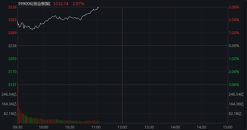 创业板指日内涨幅扩大至3%,CPO、太空光伏等板块涨幅居前。