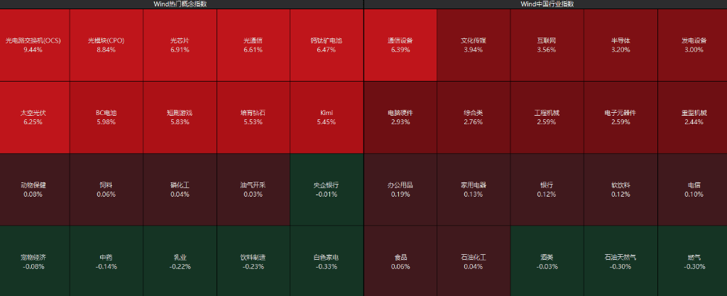 光伏产业链再度爆发,太空光伏、光伏玻璃等掀起涨停潮,此前有报道称,特斯拉计划扩大太阳能电池制造业务,目标在未来三年内实现每年100吉瓦的太阳能制造能力。算力硬件股大涨,CPO、存储器方向领涨,“易中天”全线爆发。