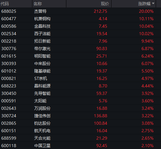 光伏板块再度大涨,太空光伏暴涨,杰普特20CM涨停,杭萧钢构、金晶科技、西子洁能等纷纷涨停。