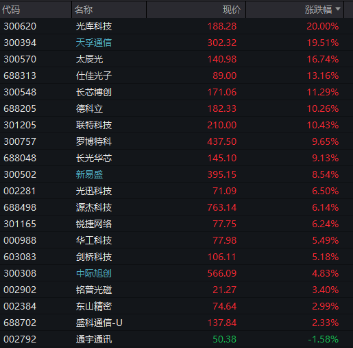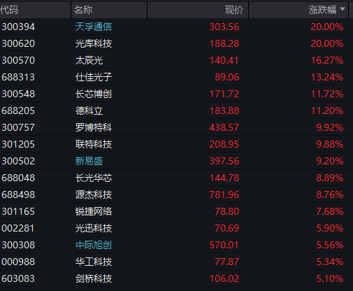 天孚通信20CM涨停,新易盛、中际旭创等纷纷拉升。