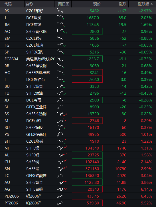 商品:国内商品期货涨跌不一,截至发稿,贵金属涨幅居前,铂金涨10.29%;基本金属全部上涨,沪锡涨4.40%;非金属建材全部上涨,PVC涨0.70%;黑色系多数下跌,焦炭跌1.25%;能源品全部下跌,低硫燃料油跌1.06%;航运期货全部下跌,集运指数(欧线)跌0.45%;新能源材料多数下跌,工业硅跌0.29%。