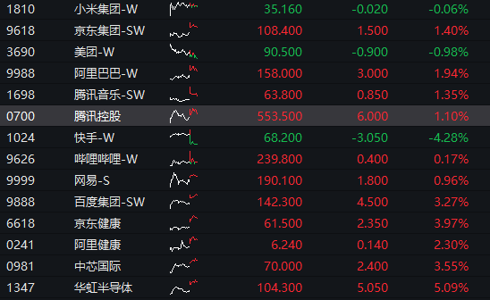 盘面上,科网股多数上涨,腾讯、阿里均涨超1%,百度涨超3%,快手逆势大跌超4%。
