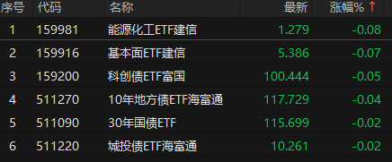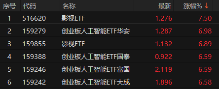 2月9日,ETF收盘涨跌不一,影视ETF(516620)领涨7.50%,创业板人工智能ETF华安(159279)涨6.98%,影视ETF(159855)涨6.89%,能源化工ETF建信(159981)领跌0.08%,基本面ETF建信(159916)跌0.07%,科创债ETF富国(159200)跌0.05%。