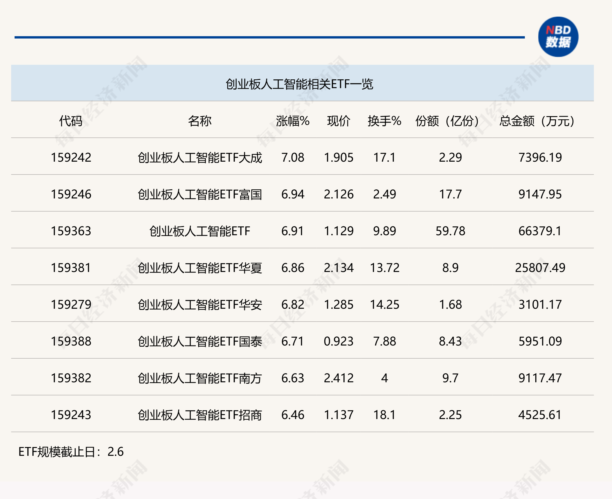 ETF涨幅榜方面,人工智能板块今日全线大涨,其中,创业板人工智能ETF大成(159242)半日涨幅达到7.08%,领涨整个ETF市场,另外,包括创业板人工智能ETF富国(159246)在内的7只创业板人工智能ETF半日涨幅也超过6%,表现强劲。