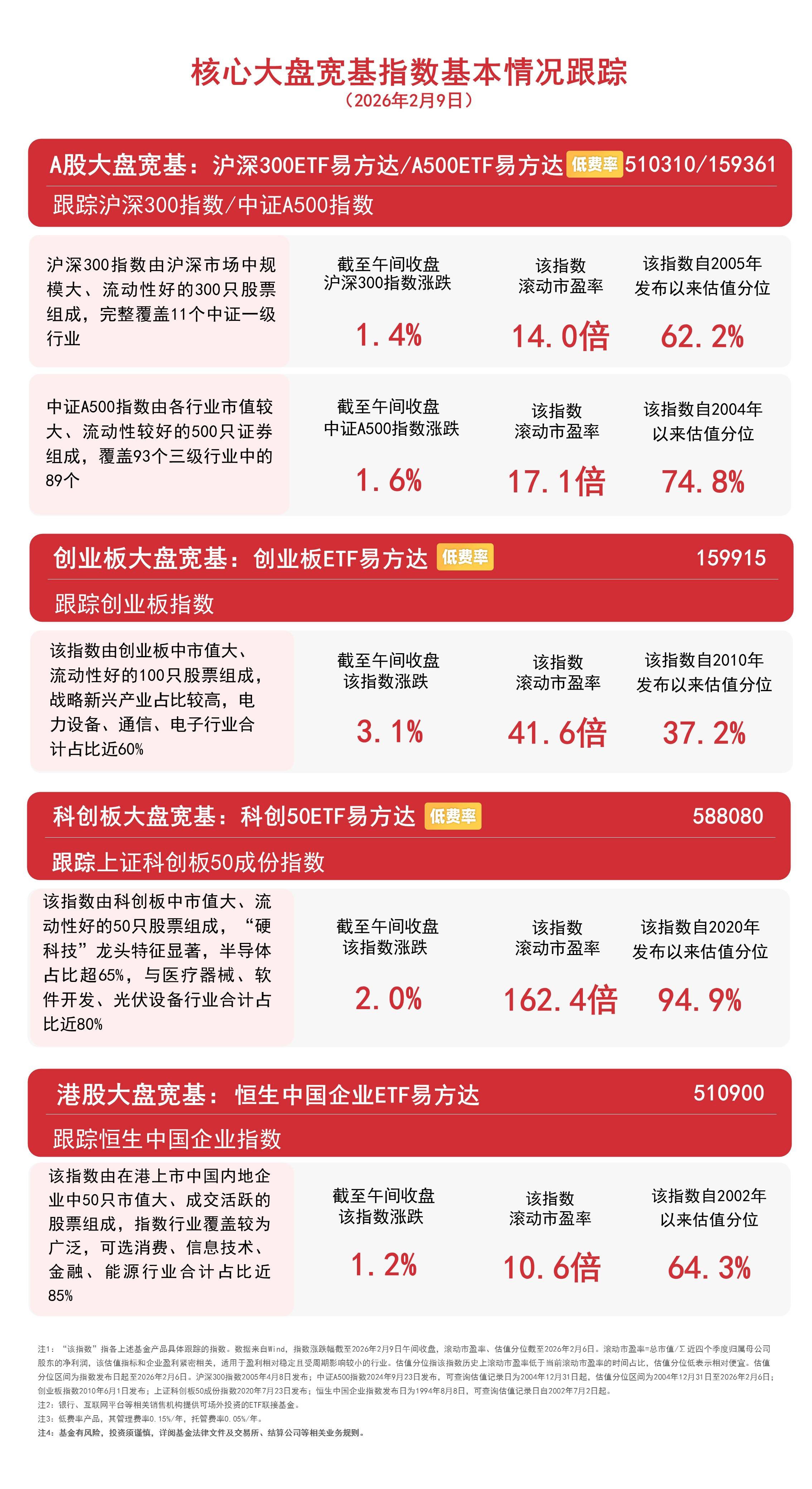 截至午间收盘,中证A500指数上涨1.6%,沪深300指数上涨1.4%,创业板指数上涨3.1%,上证科创板50成份指数上涨2.0%,恒生中国企业指数上涨1.2%。