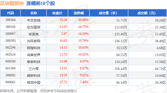 证券之星消息,2月9日区块链板块较上一交易日上涨2.61%,中文在线领涨。当日上证指数报收于4123.09,上涨1.41%。深证成指报收于14208.44,上涨2.17%。区块链板块个股涨跌见下表: