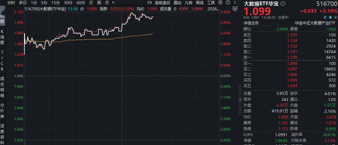 或由于字节跳动Seedance2.0视频生成模型在海内外爆火,今日(2月9日)重点布局国产算力、AI应用领域的大数据ETF华宝(516700)场内涨幅一度上探3.28%,现涨3.1%,盘中收复5日均线。