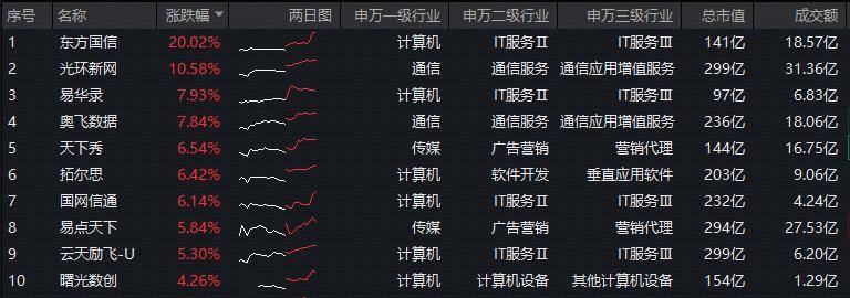 成份股方面,东方国信20CM涨停,光环新网涨超10%,易华录、奥飞数据涨逾7%,天下秀、拓尔思、国网信通等个股大幅跟涨。