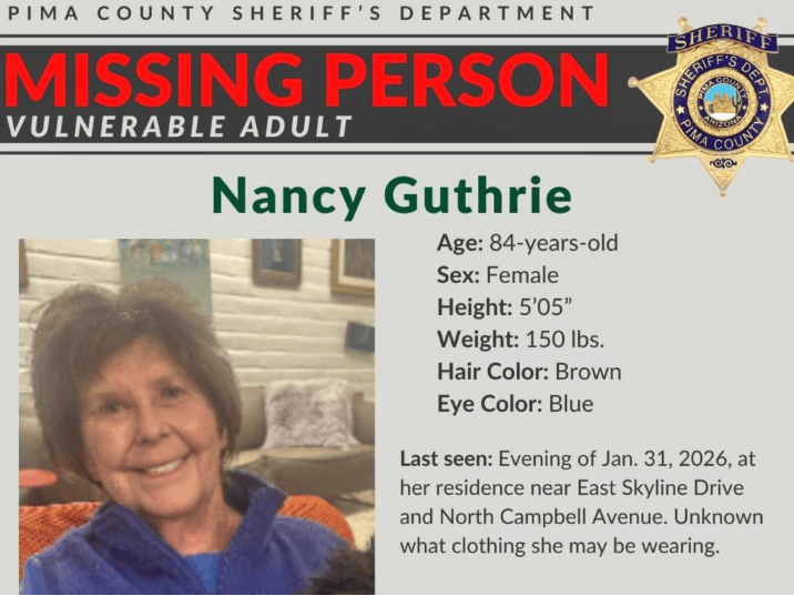 她年迈的母亲南希·格思里(Nancy Guthrie)突然在亚利桑那州神秘失踪,警方怀疑是“蓄意绑架”。