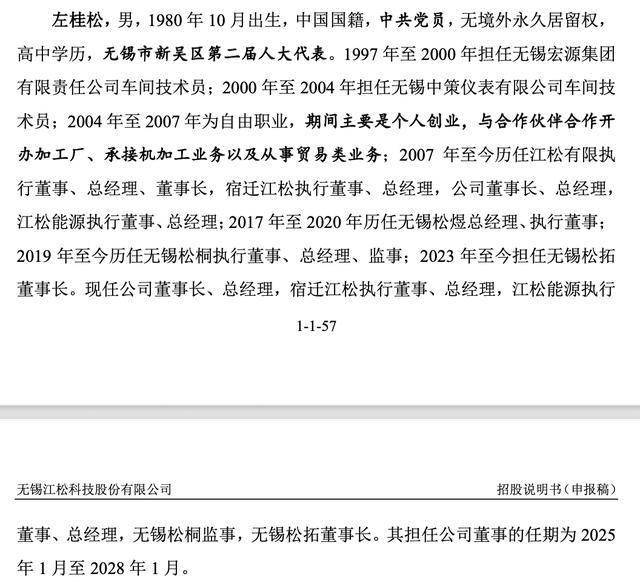 资料显示,左桂松,男,1980年10月出生,中国国籍,无境外永久居留权,高中学历。1997年至2000年担任无锡宏源集团有限责任公司车间技术员;2000年至2004年担任无锡中策仪表有限公司车间技术员;2004年至2007年为自由职业,期间主要是个人创业,与合作伙伴合作开 办加工厂、承接机加工业务以及从事贸易类业务;2007年至今历任江松有限执行董事、总经理、董事长,宿迁江松执行董事、总经理,公司董事长、总经理,江松能源执行董事、总经理;2017年至2020年历任无锡松煜总经理、执行董事;2019年至今历任无锡松桐执行董事、总经理、监事;2023年至今担任无锡松拓董事长。现任公司董事长、总经理,宿迁江松执行董事、总经理,江松能源执行董事、总经理,无锡松桐监事,无锡松拓董事长。其担任公司董事的任期为2025年1月至2028年1月。