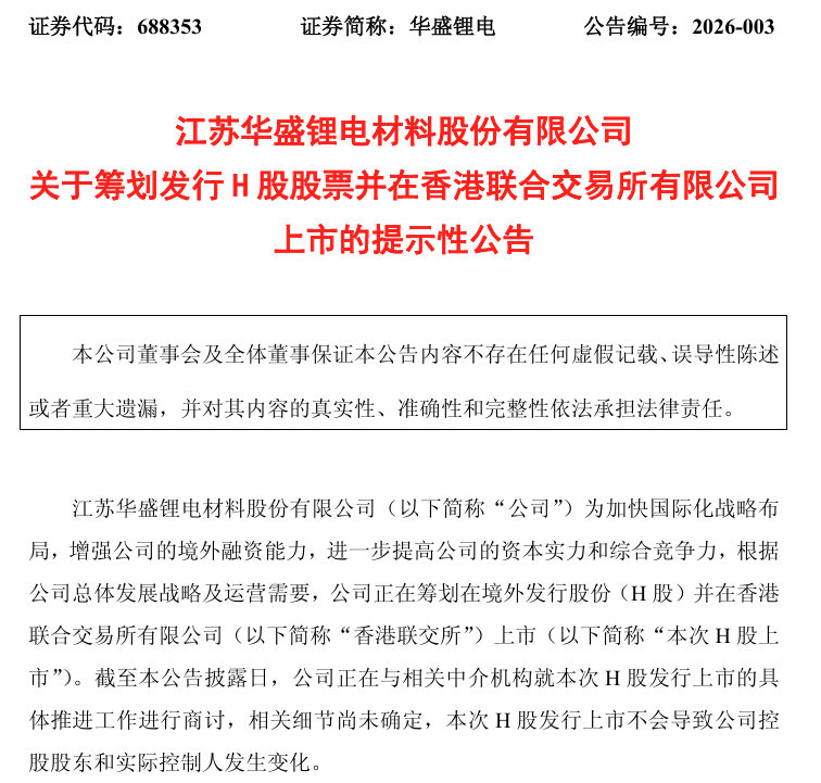 1月8日晚,华盛锂电发布公告,筹划发行H股股票并在港交所上市。作为锂电池电解液添加剂领域的重要企业,其产品涵盖碳酸亚乙烯酯(VC)、氟代碳酸乙烯酯(FEC)和双草酸硼酸锂(BOB)等,广泛应用于动力电池、储能电池及3C电子领域,客户包括比亚迪、三菱化学等国内外知名厂商。2025年,华盛锂电预计实现归母净利润1200万元至1800万元,同比大幅增长106.87%至110.30%,成功实现扭亏为盈。
