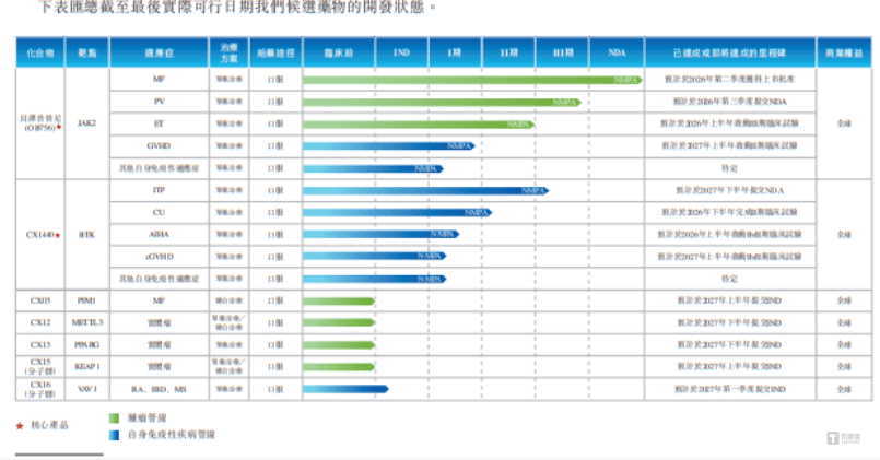 截至招股说明书签署日,邦顺制药已建立涵盖一款新药上市申请(NDA)阶段候选药物(贝泽昔替尼)、一款注册性临床阶段候选药物(CX1440)及五款临床前阶段候选药物(CX03、CX12、CX13、CX15及CX16)的管线,其中贝泽昔替尼用于治疗骨髓纤维化(MF)的进展最快,已进入NDA阶段。