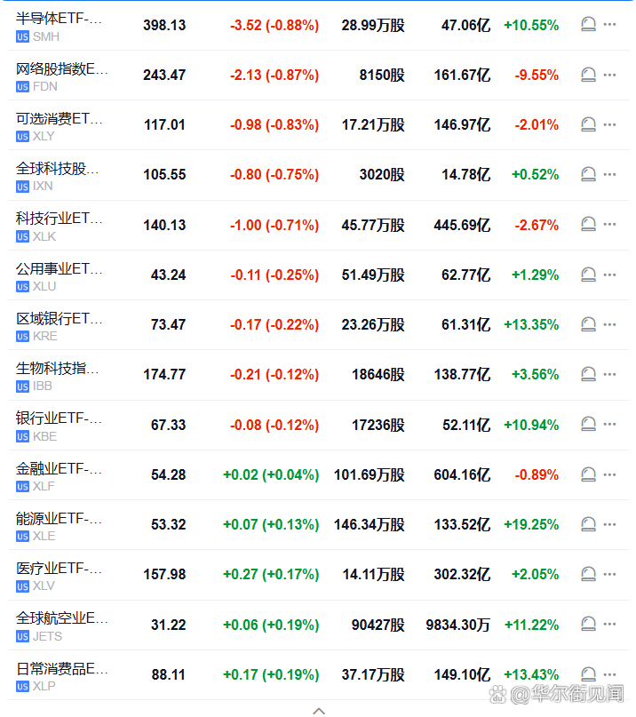 半导体ETF跌0.88%,网络股指数ETF跌0.87%,可选消费ETF跌0.83%,在美股盘初领跌行业ETF,能源业ETF涨0.13%。
