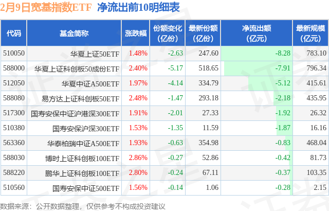 当日有56只宽基指数ETF基金出现资金净流出,其中净流出排首位的是华夏上证50ETF(510050),份额减少了2.63亿份,净流出额为8.28亿元。