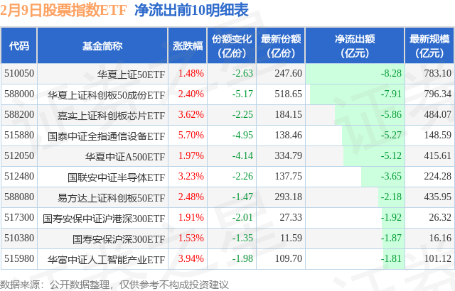 当日有263只股票指数ETF基金出现资金净流出,其中净流出排首位的是华夏上证50ETF(510050),份额减少了2.63亿份,净流出额为8.28亿元。
