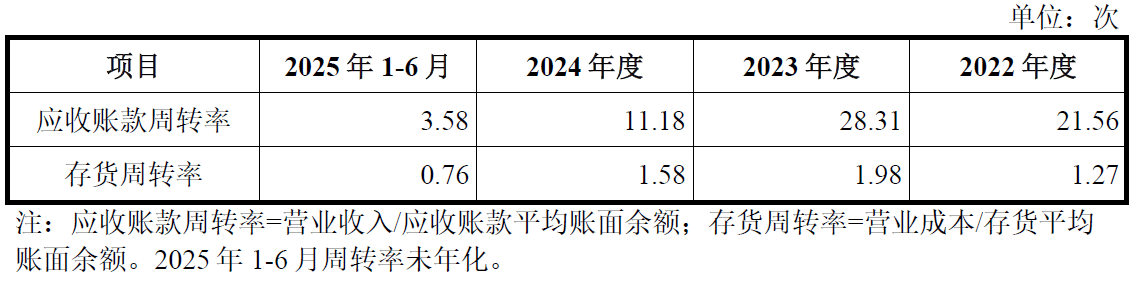 应收账款周转效率的持续恶化,是锐石创芯面临的另一大财务难题。2023年、2024年及2025年上半年,公司应收账款周转率分别为28.31、11.18和3.58,呈现断崖式下滑态势,意味着公司资金回收速度持续变慢,应收账款占用资金规模不断增加,流动性压力加剧。
