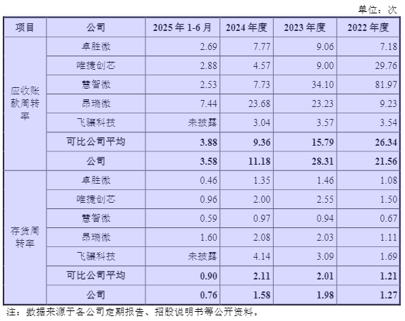 从存货规模看,报告期内锐石创芯存货账面价值持续攀升,从2022年末的1.79亿元增至2025年上半年的3.44亿元,两年半时间增长92.18%,占流动资产的比例从21.72%升至36.62%,存货占比过高导致资金周转效率偏低。