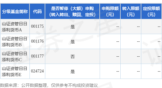 证券之星消息,2月10日山证(上海)资产管理有限公司发布《山证资管日日添利货币市场基金2026年“春节”假期前暂停申购(转换转入、定期定额投资)公告》。公告中提示,为保护投资者的利益,根据有关法律法规和基金合同的相关规定,基金管理人决定于2026年2月12日、2026年2月13日暂停办理本基金的申购(含转换转入、定期定额投资)业务,自2026年2月12日起山证资管日日添利货币市场基金2026年“春节”假期前暂停申购(转换转入、定期定额投资),下属分级基金调整明细如下:
