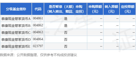 证券之星消息,2月10日泰康基金管理有限公司发布《泰康现金管家货币市场基金2026年“春节”假期暂停申购、转换转入业务公告》。公告中提示,为(1)根据《国务院办公厅关于2026年部分节假日安排的通知》(国办发明电〔2025〕7号)及沪深证券交易所休市安排,2026年2月15日(星期日)至2月23日(星期一)为节假日休市,2026年2月14日(星期六)为周末休市,2026年2月24日(星期二)起照常开市。(2)为保证本基金的稳定运作,保护基金持有人利益,根据《泰康现金管家货币市场基金基金合同》的相关规定,本基金管理人决定于2026年2月12日至2026年2月23日暂停本基金部分基金份额的申购及转换转入业务,自2026年2月12日起泰康现金管家货币市场基金2026年“春节”假期暂停申购、转换转入业务,下属分级基金调整明细如下: