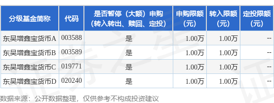 证券之星消息,2月10日东吴基金管理有限公司发布《东吴增鑫宝货币市场基金2026年春节假期前调整大额申购(含定期定额投资)、大额转换转入业务限额的公告》。公告中提示,为保护基金份额持有人的利益,保障基金平稳运作,根据《东吴增鑫宝货币市场基金基金合同》《东吴增鑫宝货币市场基金招募说明书》及其更新的有关规定,自2026年2月12日起东吴增鑫宝货币市场基金2026年春节假期前调整大额申购(含定期定额投资)、大额转换转入业务限额,申购、转换转入上限金额为1.0万元,下属分级基金调整明细如下: