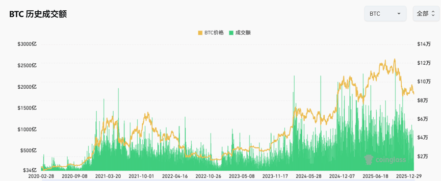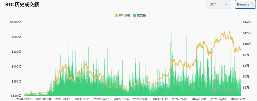 币安比特币2020年3月到2026年1月成交量与价格变化(亿美元)