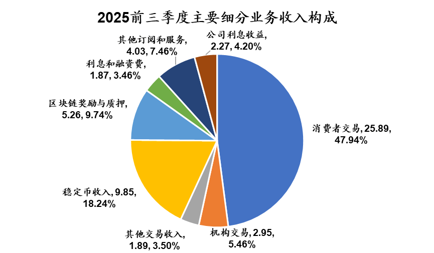 交易业务。公司收入的核心引擎,与虚拟货币交易量密不可分。2025年第三季度贡献收入约10亿美元,其中零售交易量达590亿美元,环比增长37%,机构交易量为2,360亿美元。通过收购衍生品平台Deribit,Coinbase增强了在期权和期货市场的地位,实现了加密产品全品类覆盖。