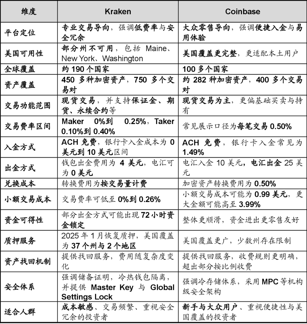 从投资者视角看,Coinbase的优势集中在美国市场覆盖完整与资金进出体验顺畅,更适合作为美国零售用户的主入口平台;Kraken则在资产覆盖广度、交易功能完整度以及费率区间更具竞争力方面更占优,适合对成本与交易效率更敏感的交易型客户。同时,Coinbase、Gemini和Kraken因其合规性和强大的基础设施,在美国机构投资者中很受欢迎。未来Kraken若能持续提升美国本土可用性并扩大零售触达,其份额具备上行空间;但在美国大众用户心智与合规入口属性方面,Coinbase仍将保持较强领先优势。