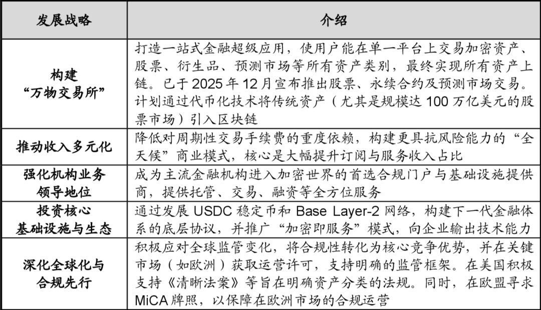 Coinbase定位为连接传统金融与加密经济的桥梁,核心战略是基于严格合规性,逐步从加密货币交易平台转型为综合性加密经济基础设施。它通过用户友好的界面和高安全标准,吸引北美和欧洲市场的零售与机构客户。