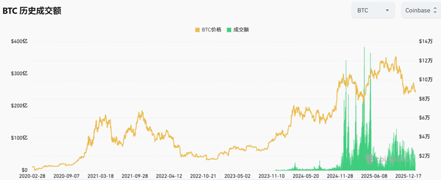 coinbase比特币2020年3月到2026年1月成交量与价格变化(亿美元)
