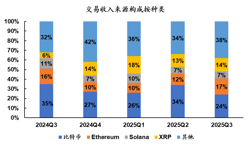 截至目前可以看到,公司交易资产的构成也在变化。2025年第三季度,以太坊ETH的交易活跃度显著提升,其交易量占总交易量的比例从上一季度的15%上升至22%。虽然比特币BTC交易量和收入仍为最高,但其占比因ETH市场份额扩大而有所下降。