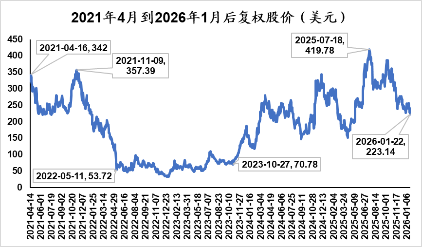 2021年4月Coinbase上市之后股价随着比特币价格降低快速回落,10月见底回升,在11月达到顶峰,后续从高点370美元附近持续下跌,最低跌至30美元附近,最大回撤高达93%。该阶段走势的核心驱动主要来自:(1)4月虚拟货币全球监管趋紧,土耳其禁止加密货币支付;印度考虑立法禁止并处罚持有者;中国央行强调需加强监管,9月中国宣布禁止挖矿比特币价格见顶回落。(2)市场内部结构脆弱,高杠杆导致连环爆仓以及Coinbase上市后高管大幅套现,影响市场情绪。(3)美国拟大幅提高资本利得税,导致获利盘抛售离场。